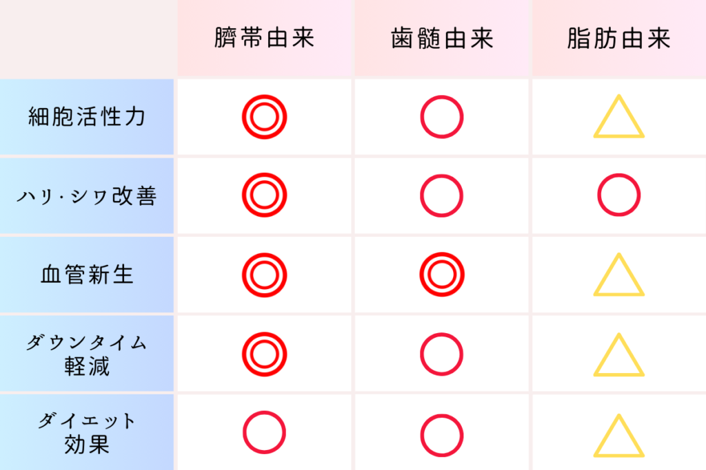 幹細胞培養上清液と一口に言っても、「臍帯由来」「脂肪由来」「歯髄由来」と人体の様々な組織から抽出されます。