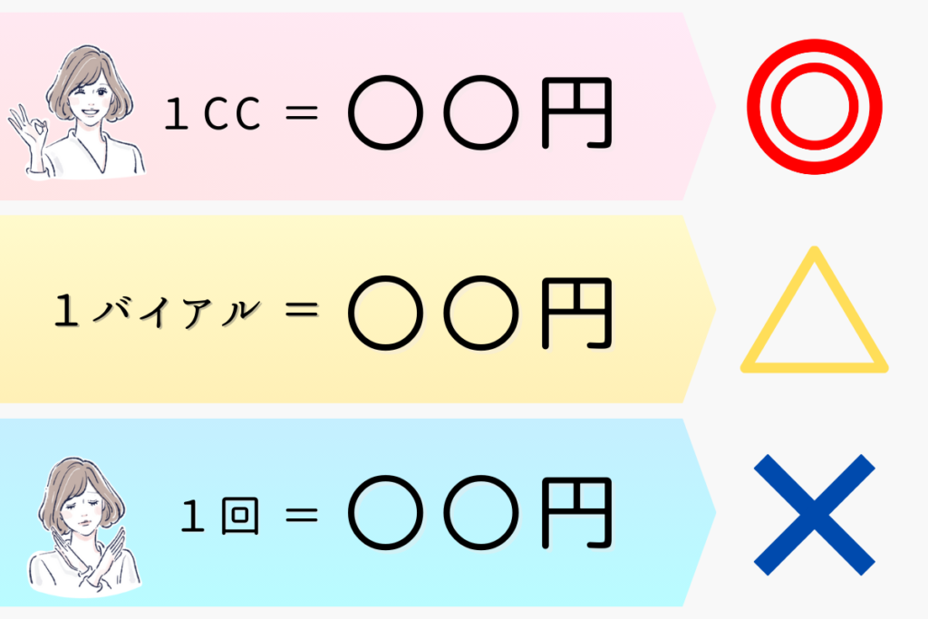 他にも、「バイアル」というクリニックごとに差がある単位(目安としては1バイアル=2〜6.6cc)を用いて価格を設定しているクリニックも存在します。